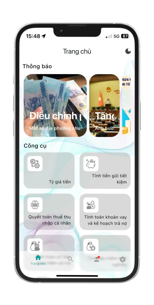 Ứng dụng tài chính toàn diện giúp bạn dễ dàng tính toán các công cụ tài chính quan trọng như tính thuế thu nhập, tính lãi suất tiết kiệm, và chuyển đổi tiền tệ. Mọi tính toán được thực hiện hoàn toàn offline, đảm bảo bạn có thể sử dụng ngay cả khi không có kết nối internet. Khi có kết nối mạng, ứng dụng sẽ tự động nhận thông báo về các cập nhật mới và thông tin liên quan từ hệ thống.