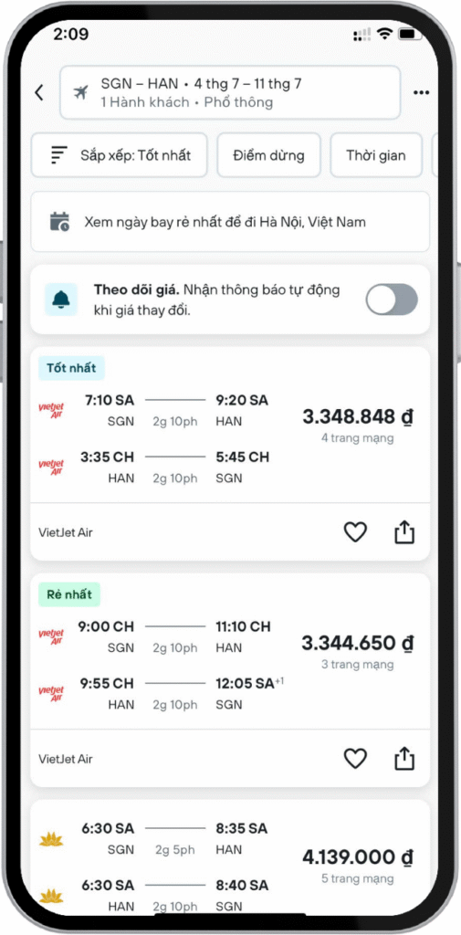 Biết khi nào giá thay đổi: Theo dõi kết quả cho chuyến đi của bạn và nhận thông báo khi giá thay đổi.