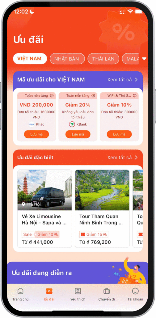 - Hỗ trợ đặt vé xe buýt, tàu, phà, vé sự kiện với giá hợp lý.