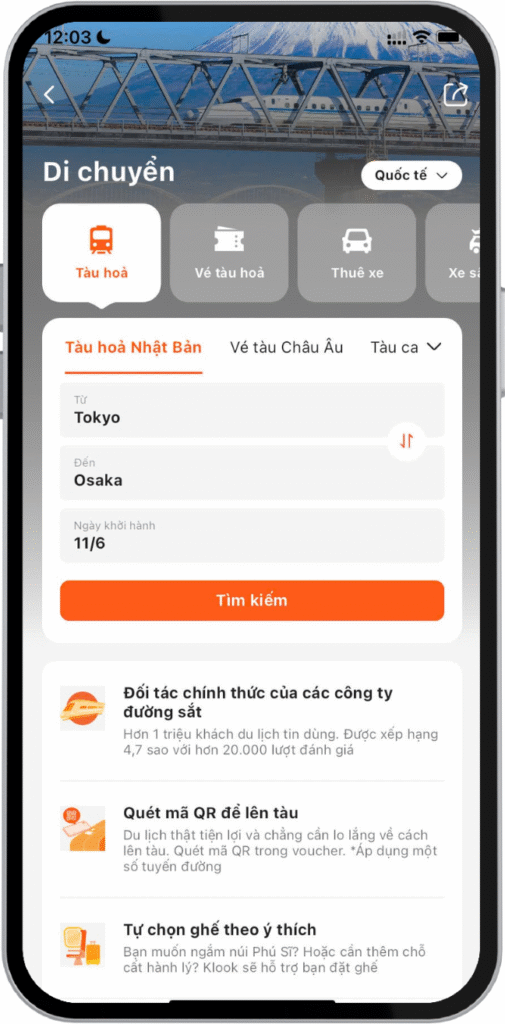 Tải ứng dụng du lịch Klook để tìm ưu đãi giá tốt cho những dịch vụ hấp dẫn như đặt vé vui chơi, đặt vé máy bay, đặt phòng khách sạn hay thuê xe tự lái, bất kể bạn đi đâu và bất cứ nơi nào.