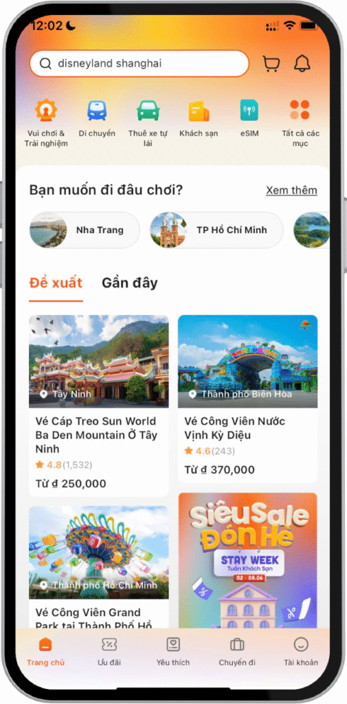 Đặt vé thật nhanh với tính năng xác nhận tức thời và vé miễn xếp hàng cho vô vàn hoạt động và điểm tham quan như Disneyland. Ngay cả khi bạn đuổi theo những ngọn sóng tại Phuket với gói nghỉ dưỡng, nếm rượu ở Melbourne hay khám phá những điều mới mẻ gần nơi bạn sống vào cuối tuần, chỉ với vài thao tác đơn giản để đặt vé, bạn sẽ có ngay mọi điều mang đến niềm vui cho mình.