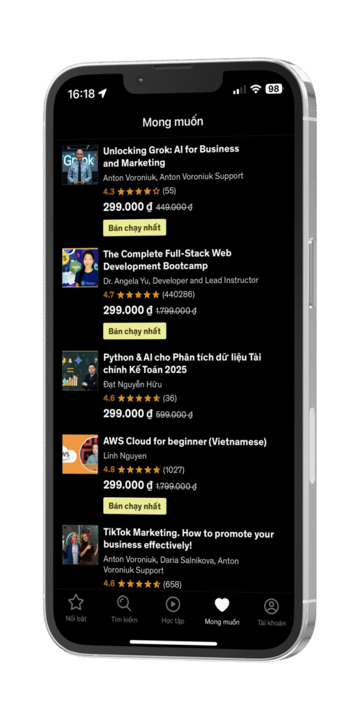 Nâng cao kỹ năng để đạt được thành công. Udemy là điểm đến hàng đầu cho các khóa học online giúp bạn phát triển về mặt chuyên môn và cá nhân. Hãy tải ứng dụng để khám phá thư viện mở rộng của chúng tôi gồm hàng nghìn chủ đề và các khóa học video online vượt trội về Coding, Phát triển, Python, Java, Kinh doanh, Tiếp thị, SEO, SEM, Vẽ, Nhiếp ảnh, v.v.